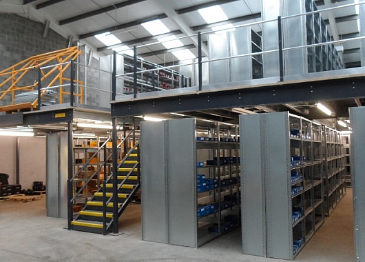 Наше решение было обеспечить 500 кв двухуровневой мезонине 6m высокое, обеспечивающий 300 бухт Стеллажи на 1-м этаже и 300 бухт на 2-ом этаже для хранения запасными частями и коробки. Набивные стеллажи этаж закончил с 1 нет. и над воротами поддонов безопасности в комплекте с загрузки пластины для передачи грузов на поддонах и выключается каждом этаже и 2 нет. стальные лестницы в комплекте будет все необходимое поручень и kickplate.